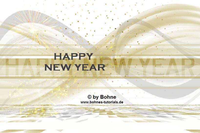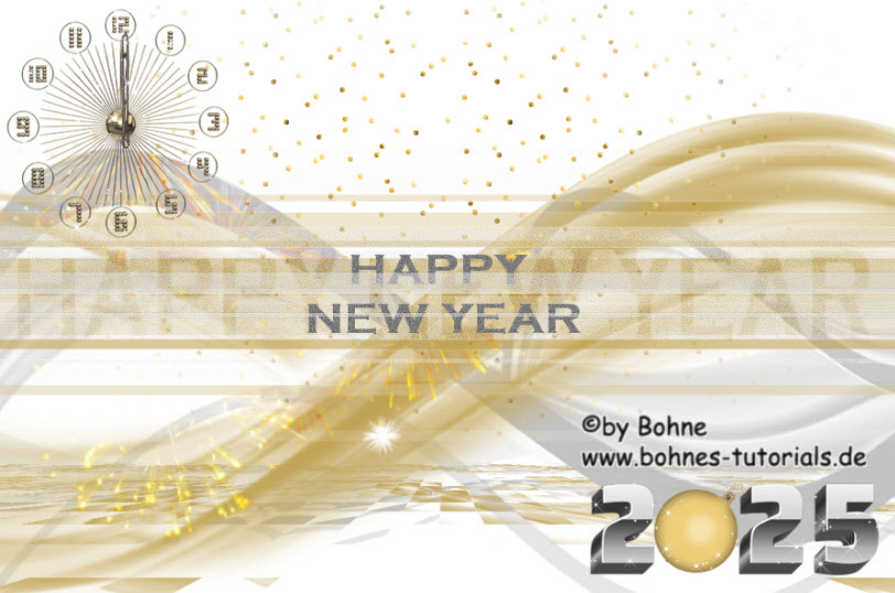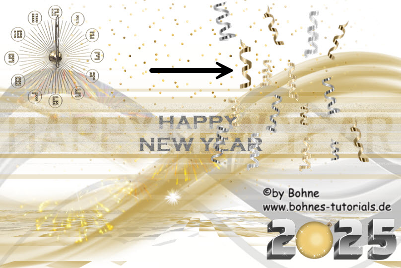 08)  Öffne dies Tube "LA_Lines 1" und ziehe sie mit gedrückter Umschalt-Taste auf dein Bild,  danach öffne "LA_HNY lettering" und ebenfalls mit gedrückter Umschalt-Taste auf dein Bild ziehen.  Mischmodus auf "Ineinanderkopieren" stellen.  Jetzt "LA_Word" kopieren und einfügen, oder Du schreibst dir selbst einen Text in der Farbe #404040.  Verschiebe den Text ca. an diese Stelle,