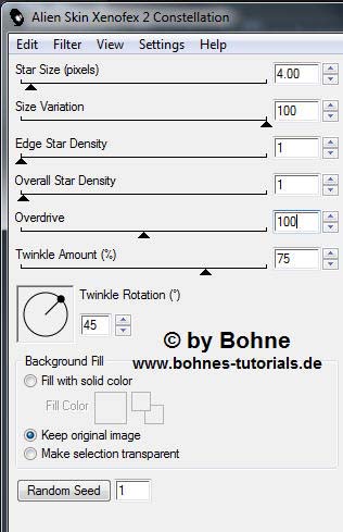 11) Aktiviere  die Ebene "ANI  1"  Filter >- Alien Skin Xenofex 2 - Constellation, übernimm diese Einstellung l