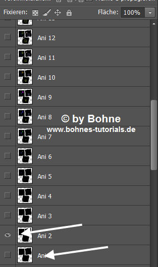 Klicke wieder das "Dupliziert ausgewähltes Frame" Symbol  Schalte jetzt die Augen der Ebenen "Ani 2" unsichtbar und die der Ebenen "Ani 3"  Sichtbar Klicke das "Dupliziert ausgewähltes Frame" Symbol  Schalte jetzt das Auge der Ebenen "Ani 3" unsichtbar und die der Ebenen "Ani 4"  Sichtbar  Wiederhole das solange bis alle 25 Ani-Ebenen durch sind   Jetzt Datei --> für Web speichern  -> als gif speichern