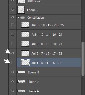 Schalte jetzt die Augen der Ebenen "Ani 1" unsichtbar und das der Ebenen "Ani 2"  Sichtbar auch bei den Constellations Ebenen