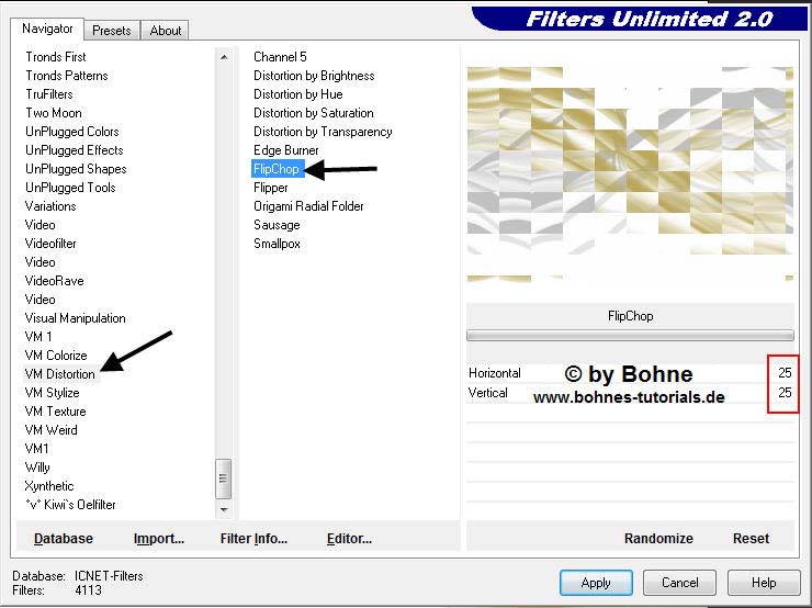 03) Wieder eine neue Ebene erstellen Über Umschalt+F5 mit deiner HGF füllen  Klicke das "Ebenenmaske hinzufügen" Symbol Über Umschalt+F5 mit dem Muster "Narah_mask_Abstract86" füllen Mit Strg+A alles auswählen  Mit Umschalt+Strg+C auf eine Ebene reduziert kopieren  Mit Strg+V einfügen    04) Filter  -> VM Distortion -> FlipChop, mit dieser Einstellung