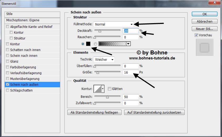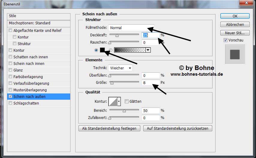 03) Öffne  jetzt den HG "LA_BG Grau klein" und ziehe  ihn mit gedrückter Umschalt-Taste auf  dein Bild. Mischmodus stelle auf weiches Licht.  Ebenenstil hinzufügen -> Schein nach außen