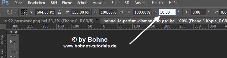 Filter -> Scharfzeichnungsfilter -> Stärker scharfzeichnen  Mit Strg+J duplizieren Bearbeiten -> Transformieren -> Horizontal spiegeln  Bearbeiten -> Transformieren -> Vertikal spiegeln Bearbeiten -> Transformieren -> Drehen, trage hier 10° ein