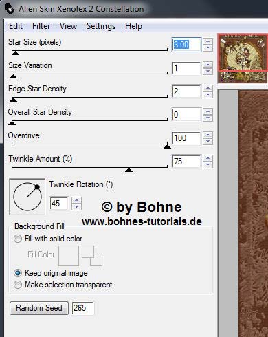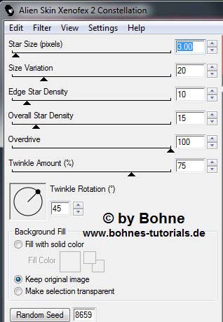 Gehe auf die Ebene "B2", Effekte - Alien Skin Xenofex 2 - Constellation, klicke einmal dauf Random Seed  diesen Vorgang wendest du auch bei der Rasterebene "B3" an.
