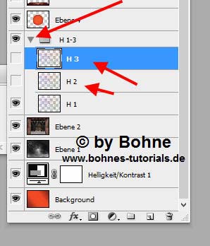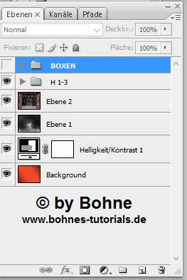 Jetzt kannst Du die  Ebene 4 die mit der  Maske wieder löschen  Mit Strg+J die Ebene 2x duplizieren Stelle den Mischmodus der untersten der 3 Ebenen auf "Aufhellen"  Benenne sie "H 1" Die mittlere der drei Ebene stelle auf "Farbe"  Und Benenne sie "H 2" Die oberste der 3 stelle auf "Farbton"  Und benenne sie "H 3"  Aktiviere die "3 H" Ebenen und packe sie in eine Gruppe Benenne die Gruppe  "H 1-3"  Und die Gruppe mit  den Boxen  in  "BOXEN" um  So müsste dein Ebenenmanager jetzt aussehen