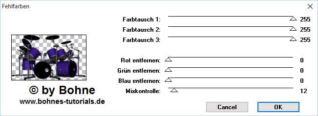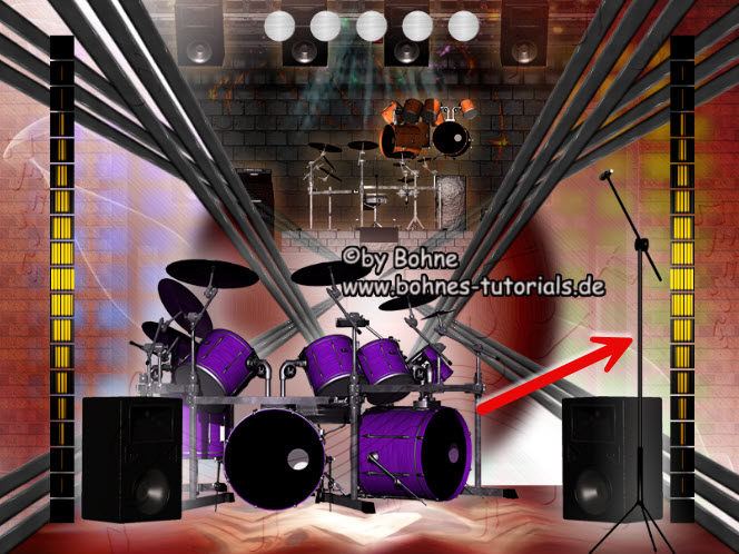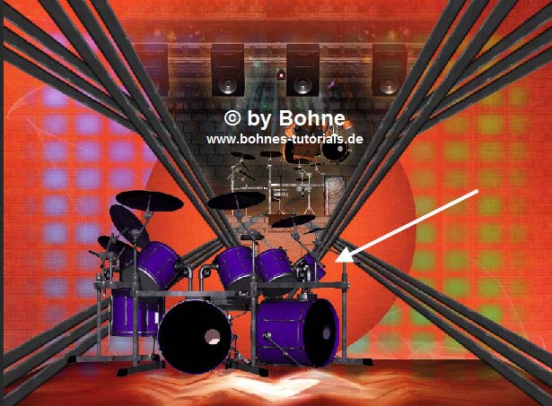 grade gespeicherte Auswahl mit Umschalt+Strg+I die Auswahl umkehren Drücke die Entf-Taste Ebene -> Anordnen -> Schrittweise nach hinten    11)  Aktiviere die darüber liegende Ebene, also die mit dem Dreieck in der Mitte.  Öffne die Tube "LA_DRUM"  Bild -> Bildgröße verkleinern auf "30%"  Ziehe es auf dein Bild Wenn Du die Drums umfärben möchtest dann Filter ->   °v° Kiwi´s Oelfilter -> Fehlfarben