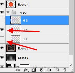 Klicke auf das Dreieck um die Gruppe "H 1 - 3" zu öffnen  Schalte hier die Ebene"H 2" und "H 3" unsichtbar