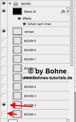 15) Klicke wieder auf das Dreieck und öffne die Gruppe "BOXEN"  Aktiviere die Ebene "rahmen"  Schalte die Ebene Sichtbar   Füge den Copyhinweis und dein Wasserzeichen hinzu