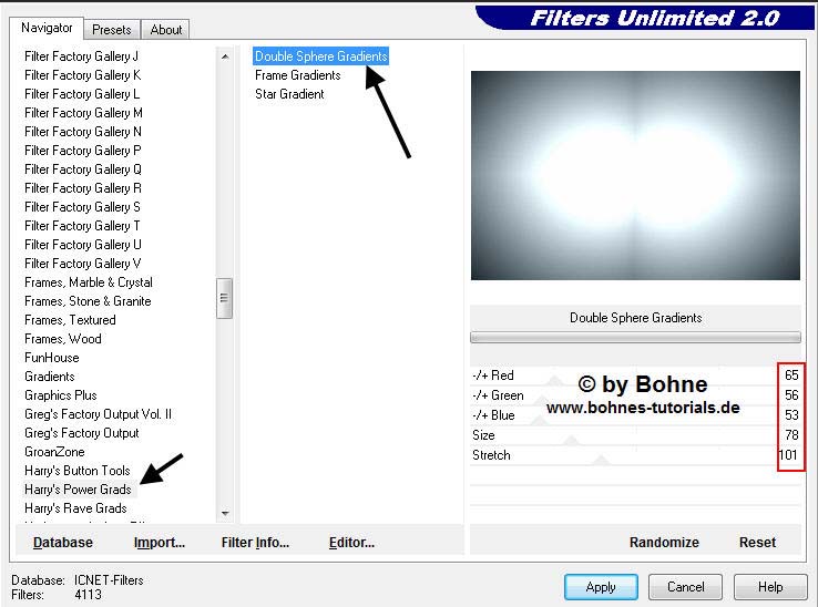 VGF und eine dunkle  HGF heraus.  Fülle das Blatt mit der VGF.  Duplizieren.    02) Gehe nun auf Filter –> Harry´s Power  Grads –> Double Sphere Gradients, mit dieser Einstellung