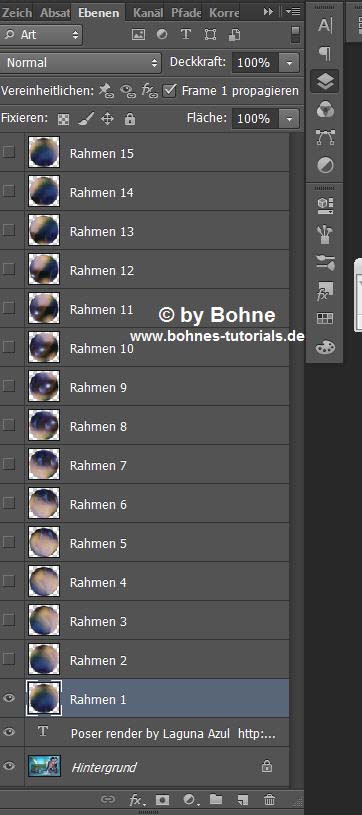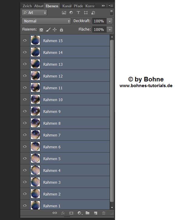 wiederhole diesen Schritt bis du die Ebene  "Rahmen 15" an hast, d.h du musst 15 Frames  haben. nun Datei-> Für Web speichern