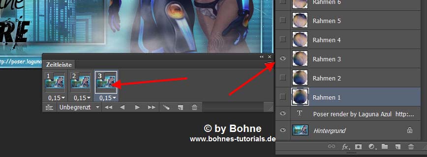 16) Klicke wieder das "Dupliziert ausgewähltes Frame" Symbol   schließe das Auge der Ebene "Rahmen 2" und öffne das der Ebene "Rahmen 3"