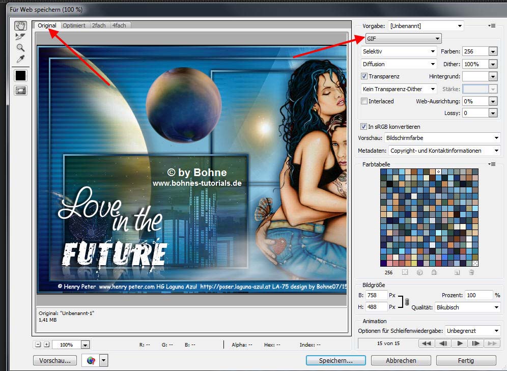 zum Schluß Datei--> für Web speicher- als gif   Ich hoffe es hat Dir Spaß gemacht !!  Dieses Tutorial ist hier registriert