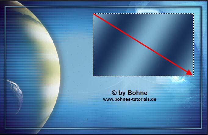 kopiere das Bild "la_back" und füge es in dein Bild  stelle den  Mischmodus auf "Ineinanderkopieren".  Filter -> Scharfzeichnungsfilter  -> Konturen scharfzeichnen. (Strg+F)   04) Kopiere die Tube "la_planet1" und füge es in dein Bild ein, auf die  linke Seite verschieben, das es seitlich und oben mit dem Rand genau  abschließt.    05)  Neue Ebene erstellen  Auswahl -> Auswahl laden -> bohne1