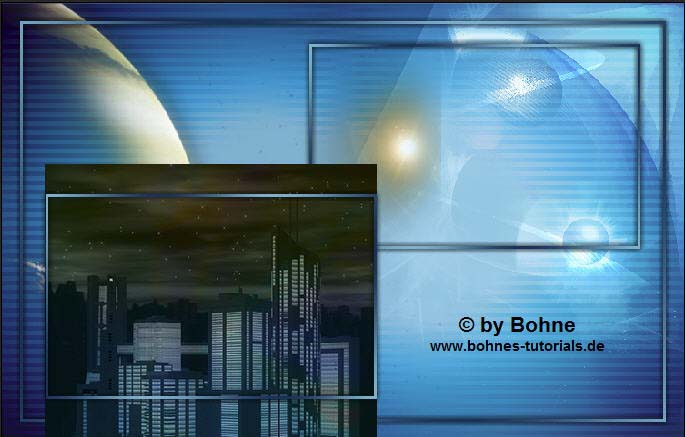 08) Öffn  dein Stadt Bild und verkleinern auf eine Breite von ca.  365px. Kopieren, als neue Ebene in dein Bild einfügen.  Gehe nun auf  Ebenen -> Anordnen -> Schrittweise  nach hinten (Strg+#)   Verschiebe  es nun in das linke unter Rechteck, siehe Bild