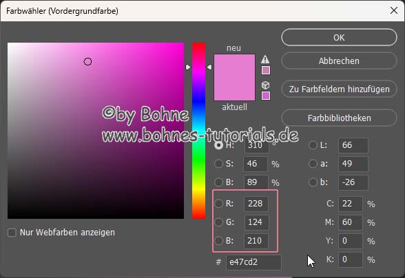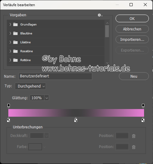 suche dir eine etwas kräftigere VGF (#cd53c9)heraus kann ruhig ein etwas kräftiger Farbton sein. Deine HGF stelle auf #404040 |  Erstelle folgenden Verlauf