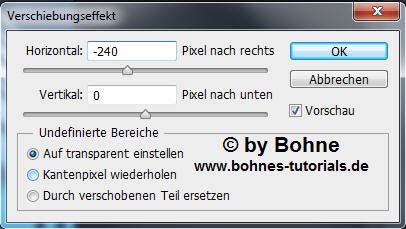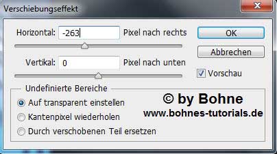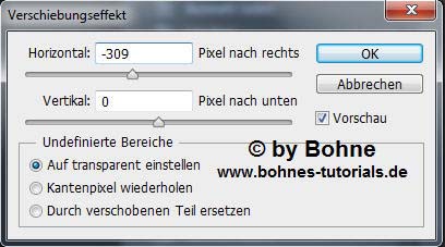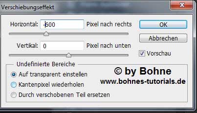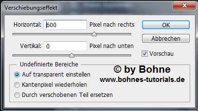 Drücke die Entf-Taste der Tastatur  Auswahl -> Auswahl aufheben     06) mit Strg+J die Ebene duplizieren  Bearbeiten -> Transformieren -> Horizontal spiegeln  Filter -> Sonstige Filter -> Verschiebungseffekt -> Horizontal -600