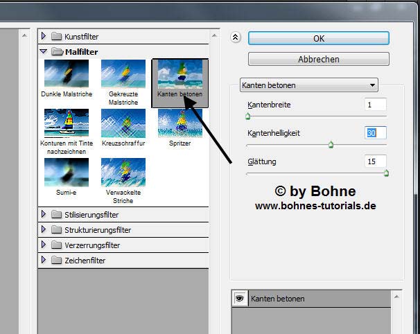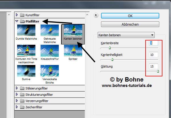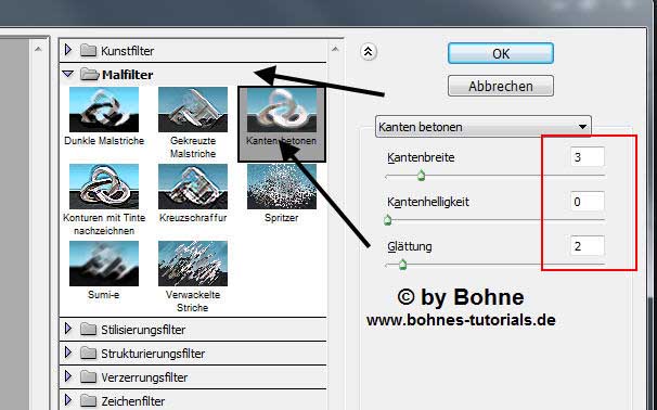 Auswahl -> Auswahl laden -> suche "Bohne #7" heraus 2-mal die Entf-Taste drücken und die Auswahl wieder aufheben  Stelle den Mischmodus der Ebene auf "Ineinanderkopieren" und die Deckkraft auf 40%  Filter -> Malfilter -> Kanten betonen