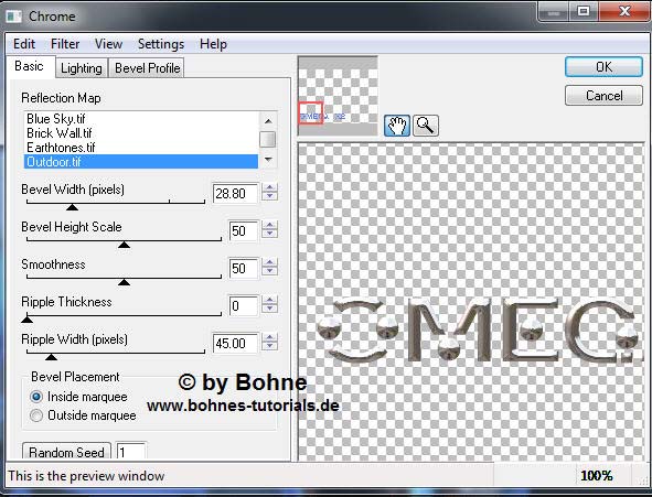 20) Aktiviere dein Textwerkzeug und suche dir einen Schrift nach gefallen aus, ich verwende diese hier  ANCREON  Schreibe deinen Text deiner Wahl.  Ebenen –>Rastern -> Text.  Filter –> Eye Candy 4000 –> Chrome, mit dieser Einstellung
