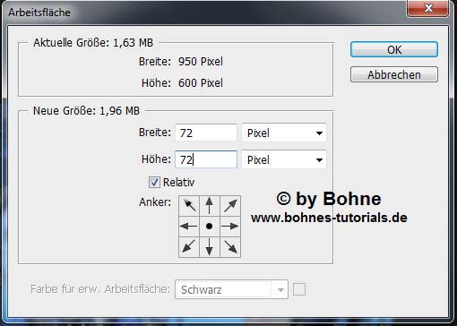 Stelle den Mischmodus dieser Ebene auf "Farbe" Mit Umschalt+Strg+C auf eine Ebene reduziert kopieren    22) Gehe zurück zu dein Bild. Oberste Ebene aktivieren.  Bild –> Arbeitsfläche. Erweitern um 72 PX