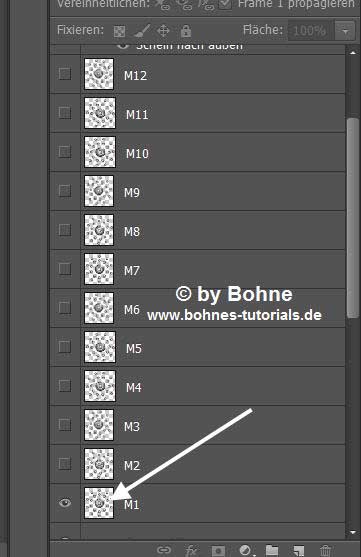 Stelle  die  Ebene "M1" unsichtbar und die Ebene "M2"sichtbar   27) Klicke jetzt wieder das "Dupliziert ausgewählte  Frames" Symbol  Stelle  die  Ebene "M2" unsichtbar und die Ebene "M3"sichtbar   28) Klicke jetzt wieder das "Dupliziert ausgewählte  Frames" Symbol  Stelle  die  Ebene "M3 " unsichtbar und die Ebene "M4"sichtbar wiederhole diese Schritte solange bis Du alle 12 M-Ebenen fertig hast  Jetzt Datei -->Für Web speichern -> als gif speichern