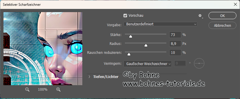 filter -> Scharfzeichnungsfilter -> Selektiver Scharfzeichner