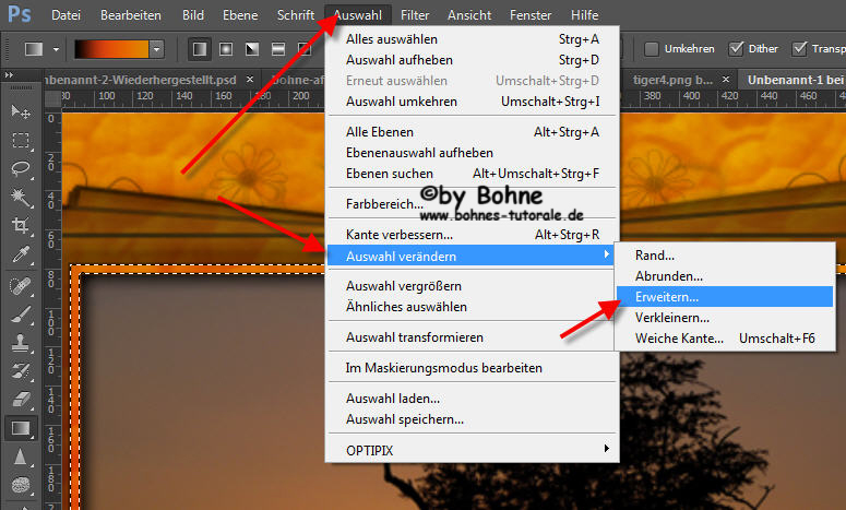 21) schalte das Auge der  Ebene3 (die mit der Maske)  wieder  unsichtbar und aktiviere Ebene2 (die mit dem Verlauf) 22) klicke das Symbol  „Neue Ebene erstellen“ 23) Auswahl-> Auswahl  verändern-> Erweitern um 3 PX