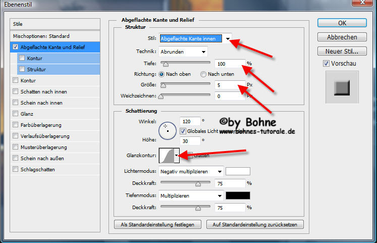 26) Ebenenstil  hinzufügen-> Abgeflachte Kante und Relief mit dieser Einstellung
