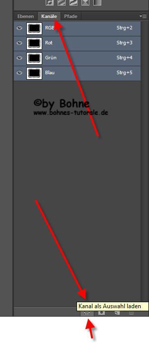 8) wechsel im  Ebenenmanager zu den Kanälenund klicke das Symbol  „Kanal als Auswahl laden“