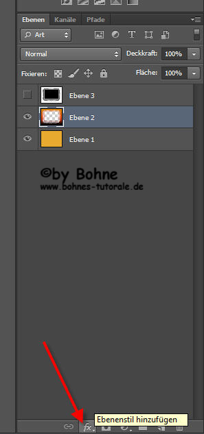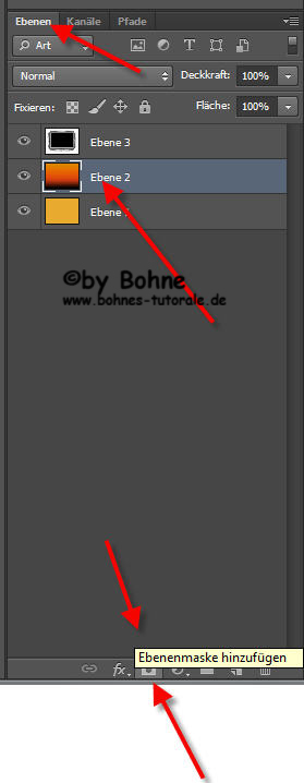 9) wechsel im  Ebenenmanager wieder zurück zu den Ebenen, aktiviere die Ebene2 (die mit dem  Verlauf) und klicke das „Ebenenmaske hinzufügen“ Symbol