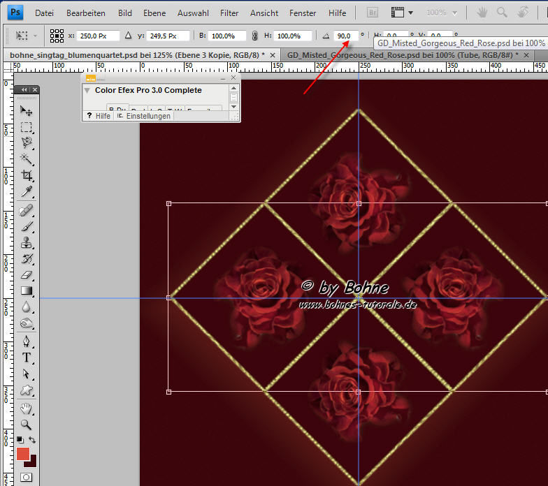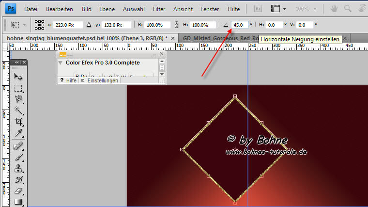 9) Auswahl-> Auswahl aufheben (Strg+D) 10) Bearbeiten-> Transformieren-> Drehen-> 45°