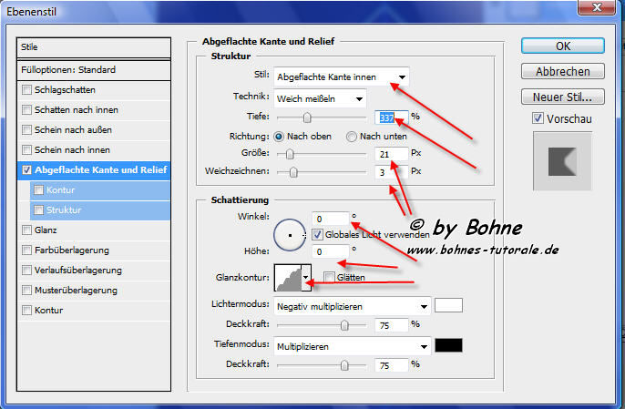 25) Ebenenstil hinzufügen-> Abgeflachte Kante und Relief unds Sichtbare auf eine Ebene reduzieren