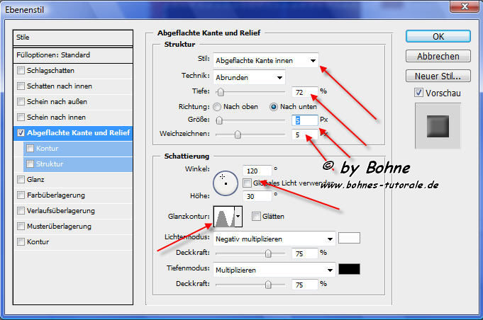 30) Ebenenstil hinzufügen-> Abgeflachte Kante und Relief und Sichtbare auf eine Ebene reduzieren