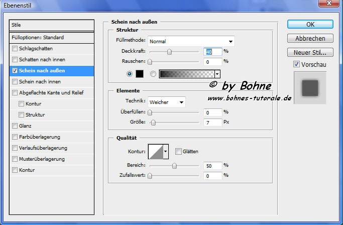 20) Aktiviere wieder die Obere Ebene-> Ebenenstil hinzufügen-> Schein nach außen