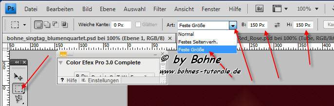 5) Aktiviere das Auswahlrechteck-Werkzeug und stelle eine Feste Größe von 150X150 pixel ein