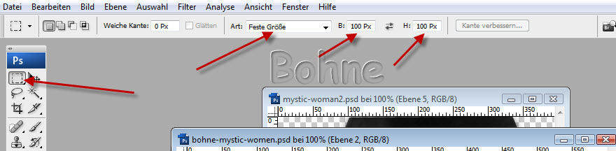 24) aktiviere das  Auswahlrechteck-Werkzeug und stelle eine feste Größe von 100 X 100 Pixel ein