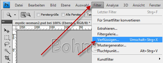 dazu klicke in der Menüleiste auf  Filter-> Verflüssigen (Umschalt+Strg+X)
