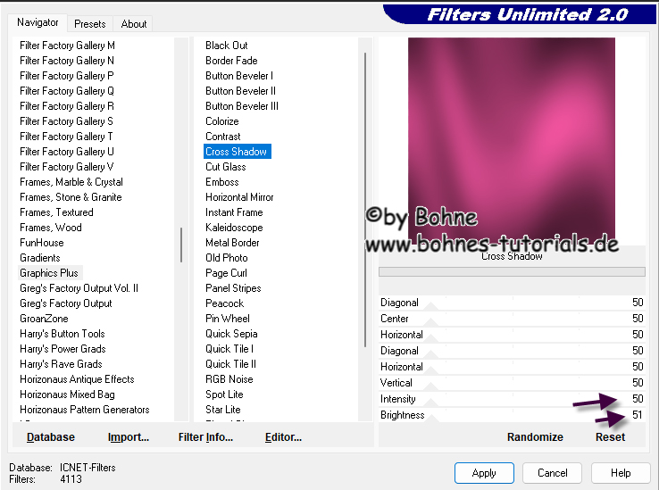 10) Neue Ebene erstellen   Auswahl -> Auswahl laden, such dir die Auswahl "Bohne-SAS 03" heraus Über Umschalt+F5 mit der dunklen Farbe füllen  Filter -> Graphics Plus -> Cross Shadow