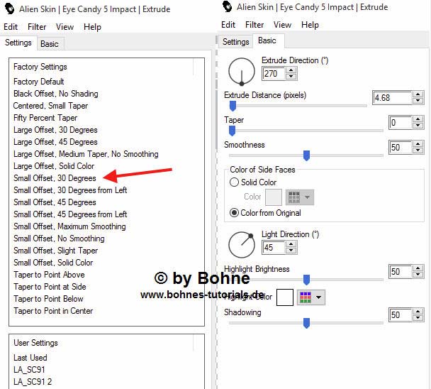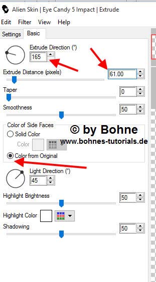 klicke einmal in dein Blatt  Ebene -> Rastern -> Form      14) Filter ->  Alien Skin Eye Candy 5:Impackt -> Extrude, mit dieser Einstellung
