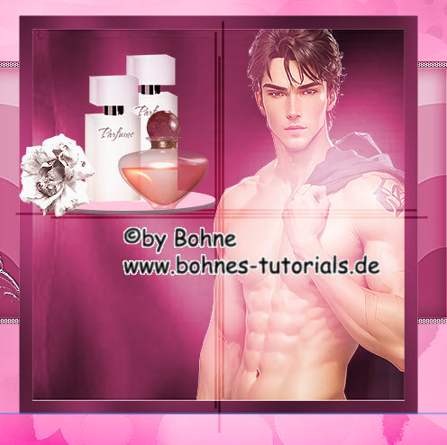16) Öffne  die Tube "la_© parfüm flacon 2 " oder dein eigenes Bild - Größe ändern, auf eine Höhe von ca. 142 px Auch hier wieder dein Tube nach deinen Bedürfnissen anpassen Ziehe es auf dein Blatt und links neben den andern Flakon verschieben      17) Öffne  die Tube "la_© rose weiß mini" oder dein eigenes ggf Größe anpassen  Ziehe es auf dein Blatt und verschiebe ca. an diese Stelle