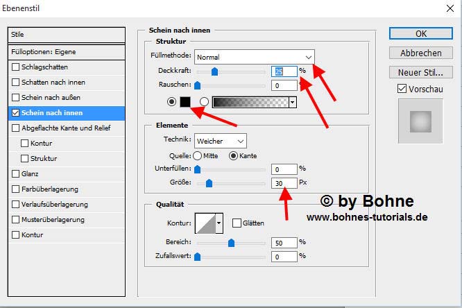 Auswahl -> Auswahl verändern -> Verkleinern um 15 Pixel  Stelle den Verlauf wie in Punkt 2 ein  Ziehe einen Linearen Verlauf, innerhalb der Auswahl, von unten nach oben auf