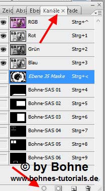 Wechsle von den Ebenen zu den Kanälen  Klicke das "Kanal als Auswahl laden" Symbol