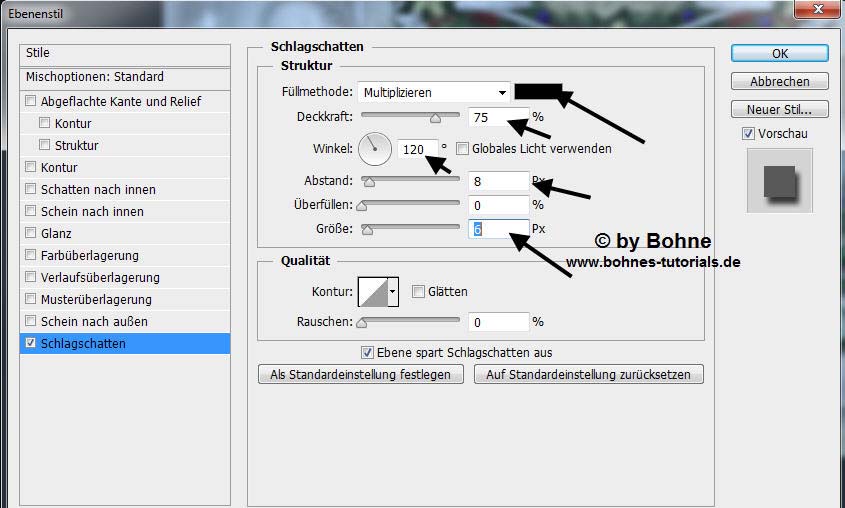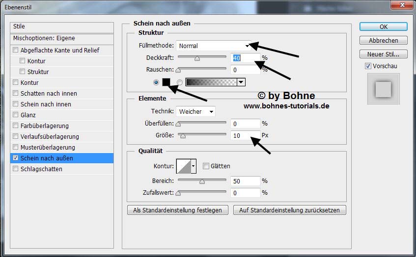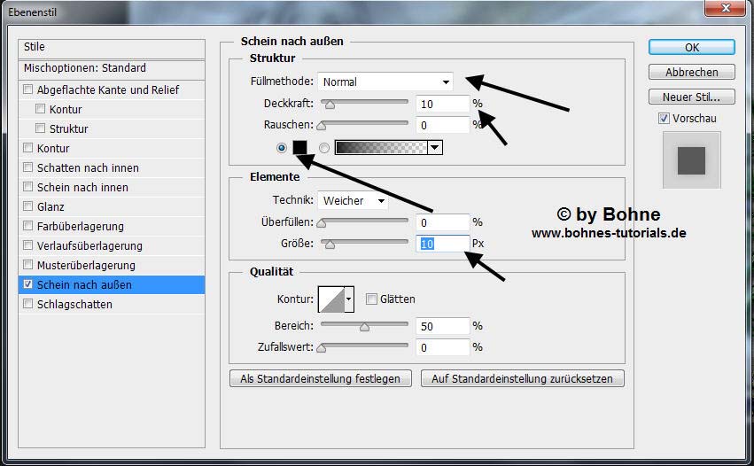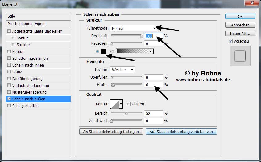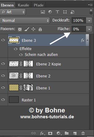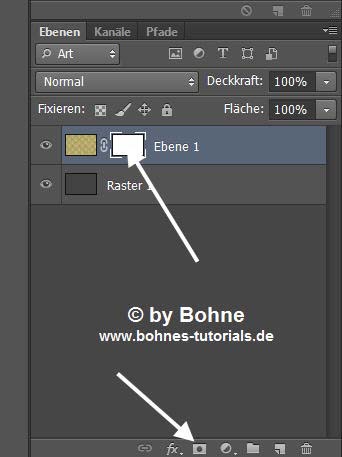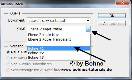 Bearbeiten -> Muster festlegen Neue Ebene erstellen  Auswahl -> Auswahl laden such dir "Bohne #2" heraus Über Umschalt+F5, mit deinem gerade erstellten Parttern füllen Mit Strg+J duplizieren Auswahl -> Auswahl laden, such dir "Bohne #3" heraus Über umschalt+F5 mit einer Beliebige Farbe füllen Ebenestil hinzufügen -> Schein nach außen