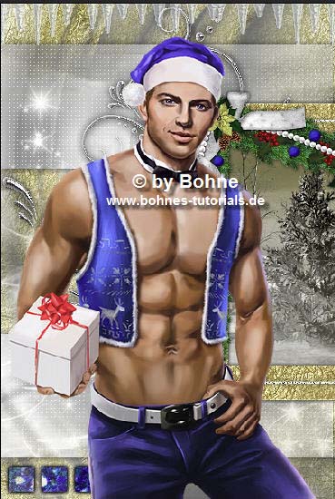 13) Öffne die Tube "LA_icicles" und füge es  in dein Bild ein.  Verschiebe es ganz nach oben und etwas nach rechts.  Achte darauf der die Eiszapfen mit dem oberen Rand des Bildes schön abschließen.      14) Öffne  dein Tube und verkleinere es auf ca. 550 px in der Höhe, bzw. nach Bedarf.  Kopieren und  in dein Bild einfügen. Scharfzeichnen. Verschiebe es ziemlich knapp an die linke Seite