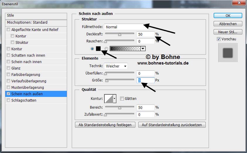 Auswahl mit Umschalt+Strg+I umkehren  Drücke die Entf-Taste Auswahl wieder  umkehren  Neue Ebene erstellen und mit einer Belibigen Farbe füllen Ebenestil hinzufügen -> Schein nach außen