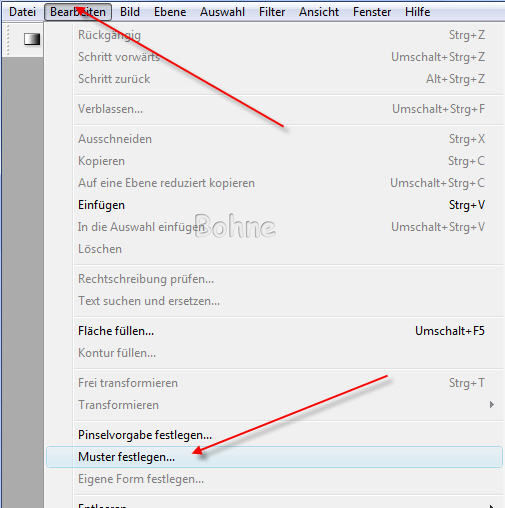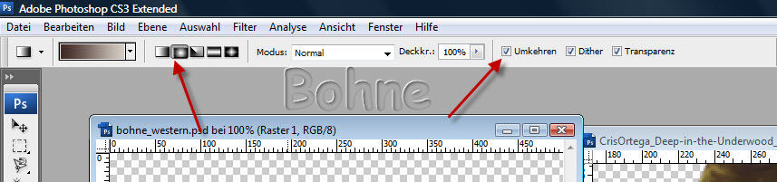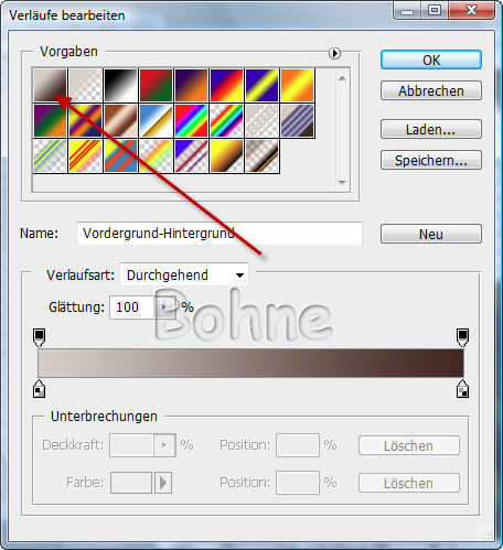 Lade das Material in Photoshop   Hast du alles dann lass uns anfangen   Öffne das Goldmuster und gehe auf Bearbeiten->   Muster festlegen.. und speichere es als Goldmuster ab        1.Öffne die Datei bohne_western.psd   2. Suche dir eine helle und eine dunkle Farbe aus deiner Tube   ich habe helle #d9d0c7 und dunkle Farbe #40231d genommen      3. Mache dir einen Farbverlauf