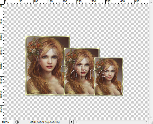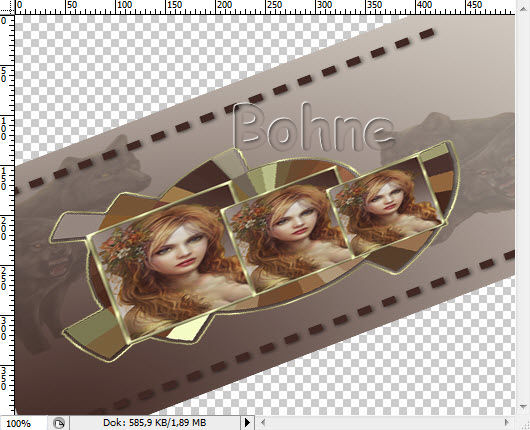 23. Auswahl aufheben  24. Neue Ebene erstellen   25. Auswahl-> Auswahl laden-> Kanal: rahmen1   26. Über Umschalt+F5 mit deinem Goldmuster füllen       30. Auswahl aufheben   31. Ebeneneffekt hinzufügen-> Abgeflachte Kanten und Relief        32 Mit dem Zauberstab-Werkzeug in den Rahmen klicken  33. Die Männer Tube "CrisOrtega_Deep-in-the-Underwood_[1]_chicktube"   Kopieren und in die Auswahl einfügen   34. Bearbeiten-> Transformieren-> Skalieren   Und die Tube wie auf den Screen zusammen schieben    und mit Return bestätigen      35. die unterste Ebenen  ausschalten   dann Ebene->  Sichtbare auf eine Ebene reduzieren   36. Bearbeiten-> Transformieren-> Skalieren   Und hier 80% eingeben und mit Return besätigen     37. Ebene duplizieren und ebenfalls auf 80% skalieren   38. Ebene duplizieren und diese auch auf 80% skalieren   39. Schiebe die 3 Rahmenbilder etwas zurecht  siehe Screen