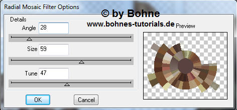 40. Ebene->  Sichtbare auf eine Ebene reduzieren      41. Ebene duplizieren und die  Original Ebene aktivieren   42. Filter-> dsb flux-> Radial Mosaik    43. Ebeneneffekt hinzufügen -> Schlagschaten     45. Ebene->  Sichtbare auf eine Ebene reduzieren   45. Bearbeiten->Transformieren-> Skalieren ->90% eintragen   und mit Return bestätigen   46. Den transparenten Bereich mit dem Zauberstab-Werkzeug aktivieren   47. Die ausgeschaltete Ebene aktivieren und das   Fügt neue Ebene hinzu Symbol klicken   48. Auswahl-> Auswahl umkehren   49. Auswahl-> Auswahl verändern-> Erweitern um 2px   Und über Umschalt+F5 mit deinem Goldmuster füllen   50. Auswahl-> Auswahl verändern-> Verkleinern um 2px   und die Entfernentaste der Tastatur drücken   51. Auswahl aufheben   52. die Oberste Ebene aktivieren und mit darunter liegender   Auf eine Ebene reduzieren   53. Bearbeiten-> transformieren-> Skalieren 90% eingeben   und mit Return besätigen  54. die untere Ebene wieder sichtbar machen und Sichtbare auf eine Ebene reduzieren   55. Über Bearbeiten-> transformieren-> Skalieren und drehen   Dein Bild so in Position bringen