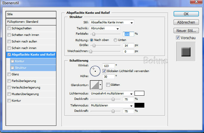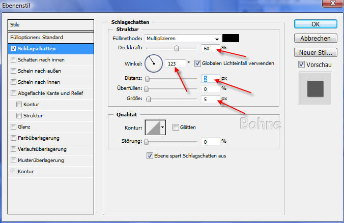 Sichtbare auf eine Ebene reduzieren   13. Neue Ebene erstellen   14. Auswahl-> Auswahl laden-> Kanal: oben1   15. Über Umschalt+F5 mit der Hintergrundfarbe füllen   16. Ebeneneffekt hinzufügen-> Schlagschatten           17. Auswahl aufheben   18. Ebene duplizieren und mit dem Verschiebe-Werkzeug   nach unten verschieben