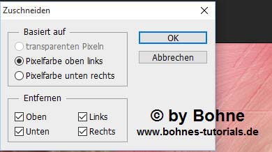 Auswahl aufheben  Offne die Maske "la_diagonal"  Ziehe sie auf dein Bild  Über Strg+T in den Transformationsmodus wechseln und die Maske auf volle Breite und Höhe ziehen  Wechsle zu den Kanälen und klicke das "Kanal als Auswahl laden" Symbol  Wechle zurück zu den Ebenen und aktivere die Ebene "Punkte"  und klicke auf das "Vektormaske hinzufügen" Symbol  Rechter mausklick auf die Ebenenmaske und "Maske anwenden" Jetzt kannst Du die  die Maske wieder löschen    14) Aktiviere wieder die unterste Ebene  Bild Arbeitsfläche -> erweitern um 6 Pixel in deiner dunklen Farbe  Öffne die Tuben "bohne-rand" und ziehe sie auf dein Bild  Stelle den Michmodus auf "Luminanz"  Füge den Copyhinweis und dein Wasserzeichen hinzu   Zum Schluß speichern unter, als jpg   Ich hoffe es hat Dir Spaß gemacht !!