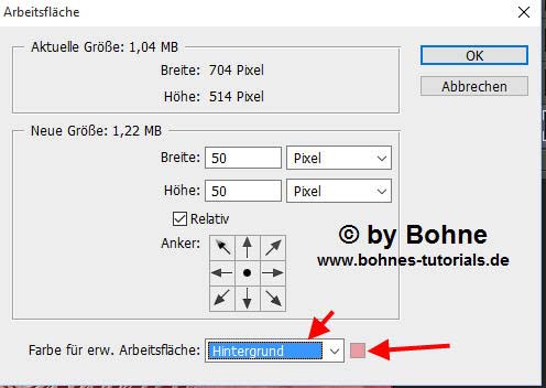 Bild -> Arbeitsfläche -> Erweitern um 50 Pixel in deiner hellen Farbe